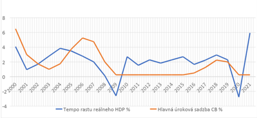 Politika centrálnych bánk je zameraná na reguláciu peňažného obehu a úrokových sadzieb, práve úrok a cena peňazí hrá kľúčovú úlohu pri formovaní podmienok pre hospodársky rozvoj a ovplyvňuje množstvo faktorov, ktoré ovplyvňujú dlhodobý výkon ekonomiky. Tempo rastu reálneho HDP je jedným z najdôležitejších ukazovateľov hospodárskej aktivity a miera jeho rastu je úzko spojená s vývojom národného blahobytu a životnej úrovne obyvateľstva. Posledné dve dekády sme boli svedkami pomerne výrazného a stabilného ekonomického rastu v obdobiach ohraničených krátkodobými výraznými prepadmi. Čím boli tieto fázy stabilného rastu podporené? Politika centrálnych bánk sa po roku 2000 mierne zmenila.